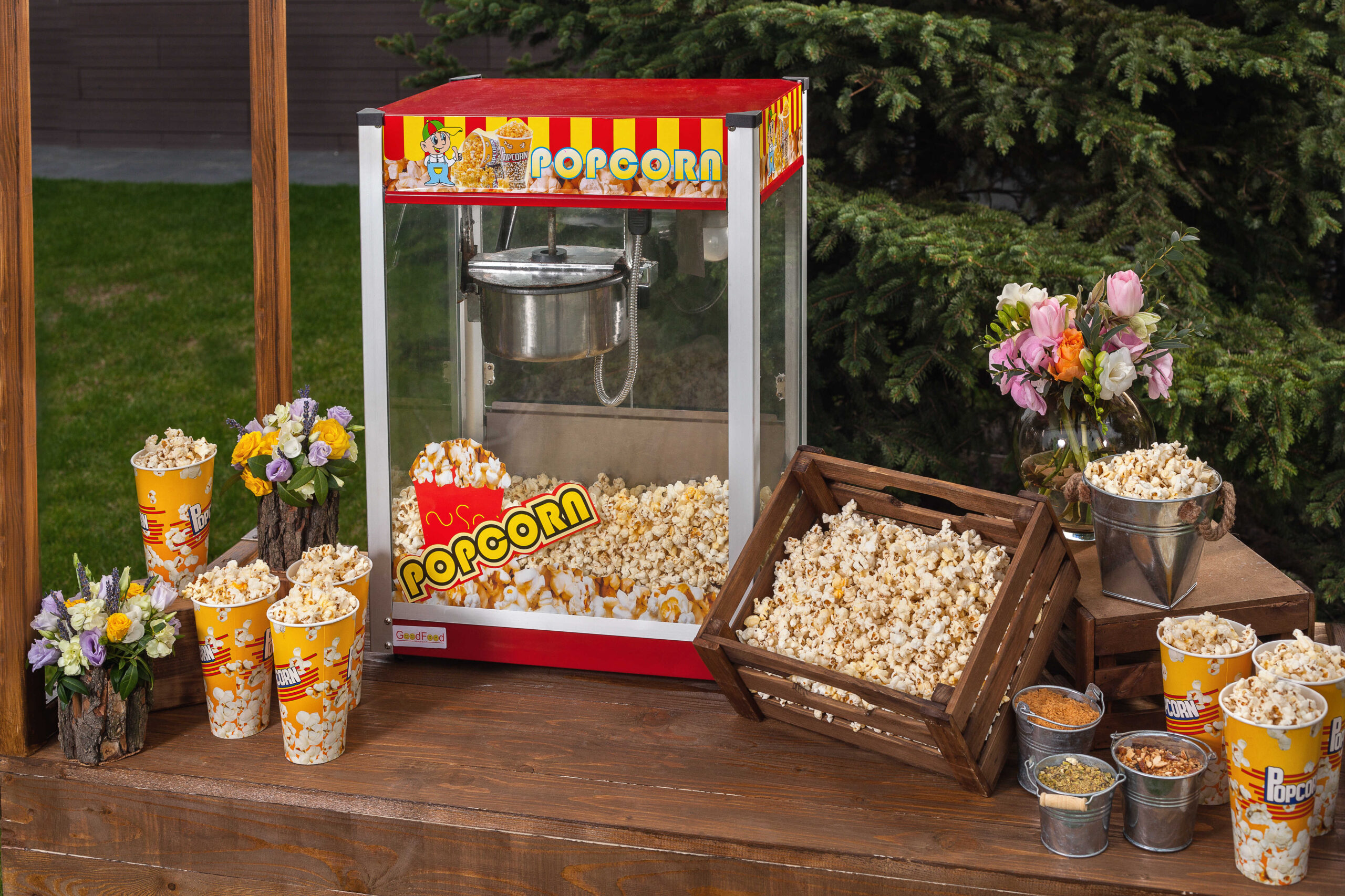 The station features a wide range of flavors and toppings: classic salty popcorn, sweet caramel, cheesy, buttery, chocolate, as well as exotic varieties like barbecue or chili.
