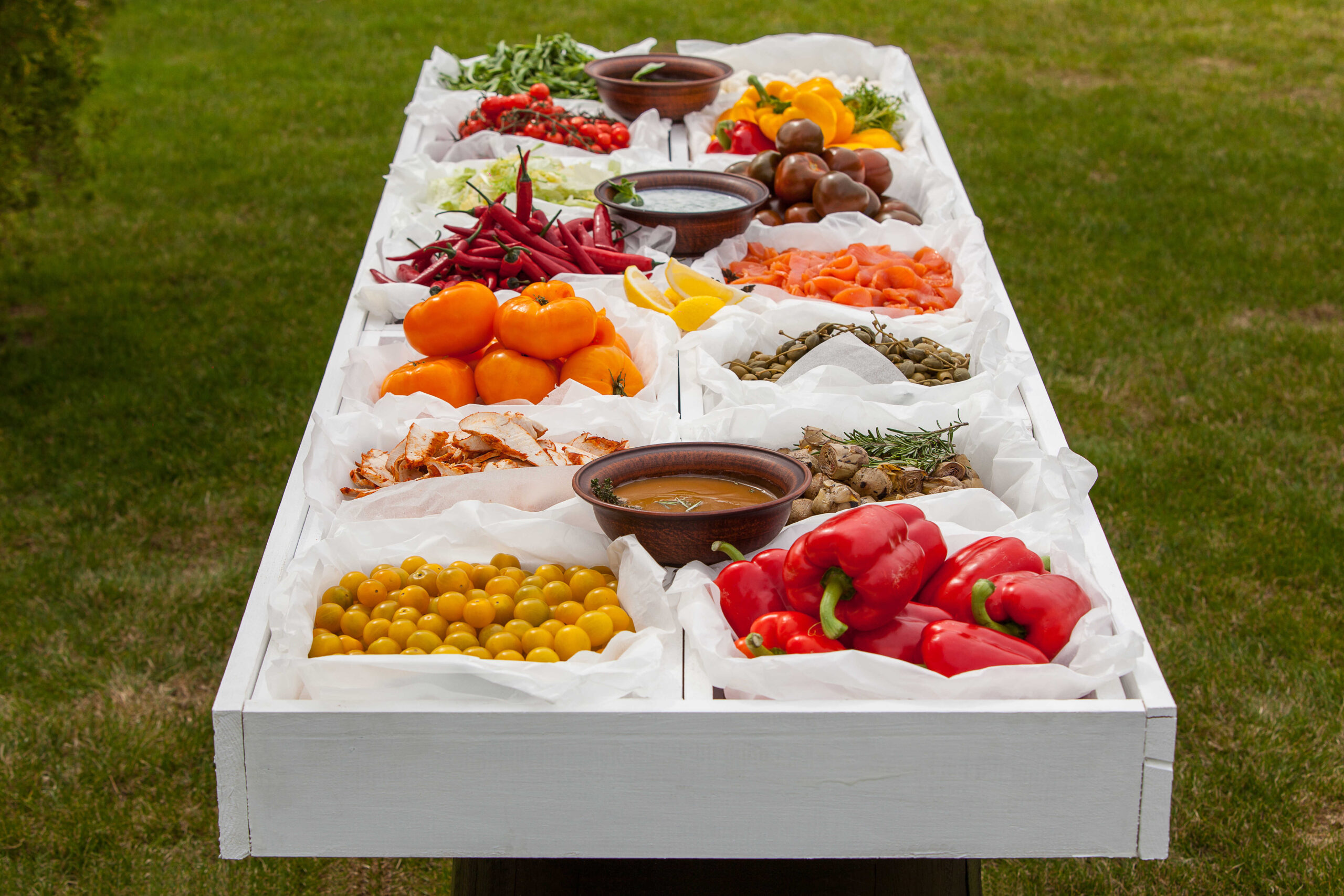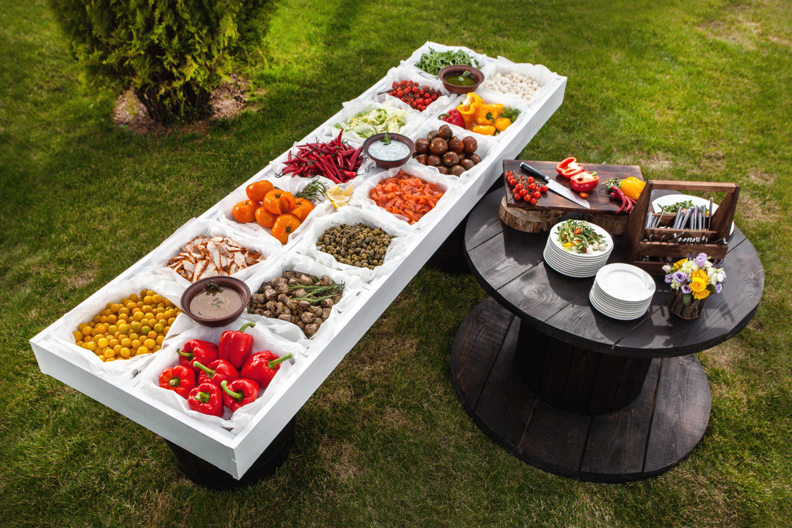 The station offers a wide selection of fresh vegetables, greens, fruits, and toppings: crisp lettuce leaves, tender spinach, juicy tomatoes, cucumbers, bell peppers, onions, avocado, carrots, sweet berries, and fragrant herbs. Guests can choose from a variety of ingredients to create their perfect salad combinations.