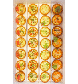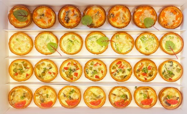 Ніжні міні кіш лорени з різноманітними начинками — вишуканий варіант для подій зі смаком. Овочі, броколі з лососем, гарбуз із горгонзолою, курка з грибами. Збалансовані, апетитні, готові до подачі.