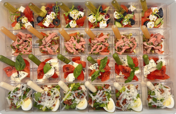 Салат-бокс — легкий і збалансований набір для подій, обідів чи кава-брейків. У коробці: класичний Капрезе, Цезар із курчам, салат із яловичиною та грильованими овочами, овочевий салат із фетою. Готові порції — зручно подати, приємно смакувати.