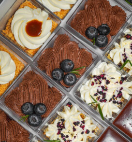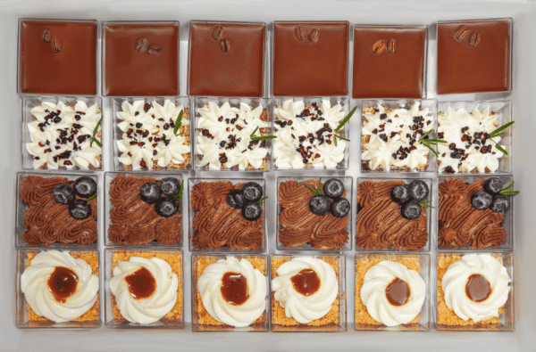 У коробці: трайфл шоколад-ромова вишня, трайфл банофі пай, трайфл лимон-чорниця, трайфл ірландська кава. Готовий десерт для свят, бранчів, весільних фуршетів, домашніх святкувань.