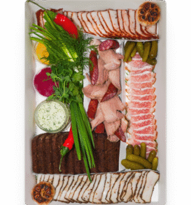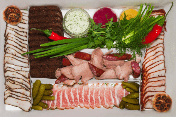 Смаки, що говорять українською. Сало, ковбаски, шинка, хрін і бородинський хліб — щедрий, виразний і рідний набір до столу. Ідеально для подій із характером.