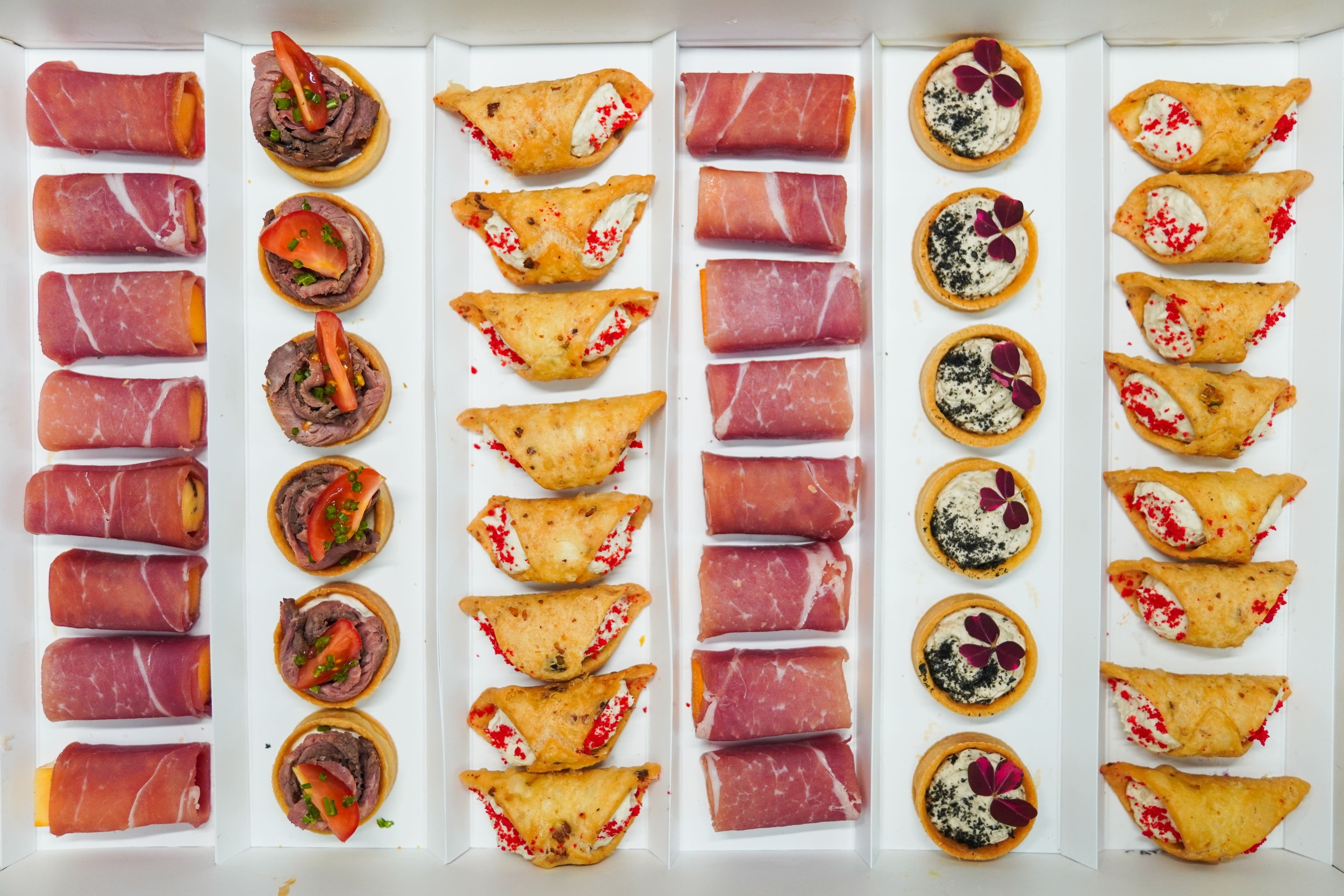 Коробка фінгер фуд з виразним та глибоким смаком. Поєднання витриманого прошуто, трюфельного крему, насиченого грибного мусу та соковитого ростбіфу — для тих, хто цінує гастрономічну повноту в кожному укусі.