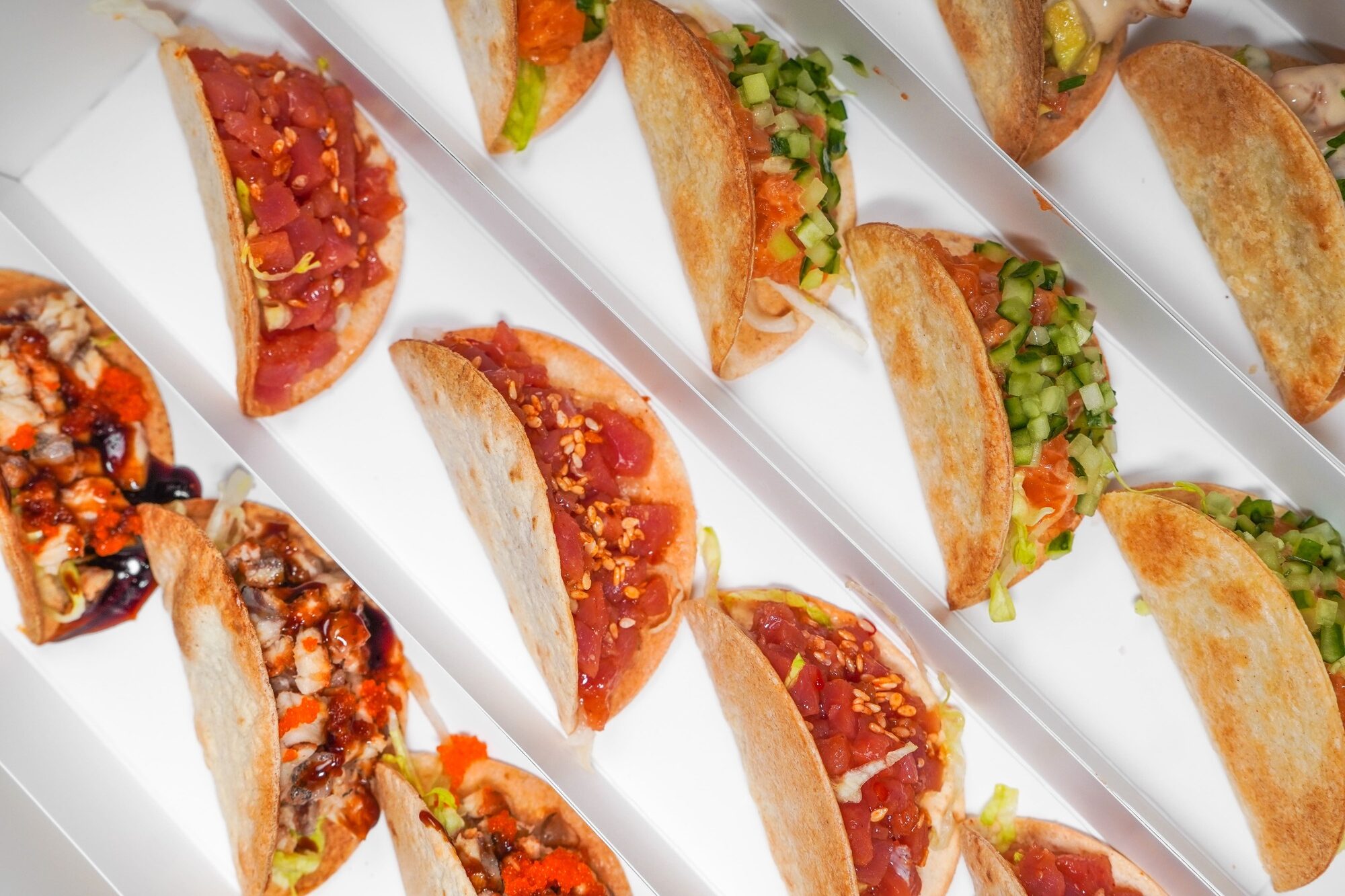 Коробка авторських такосів із морським характером. Лосось, тунець, вугор, креветки — яскраві поєднання, свіжі інгредієнти, соковиті начинки. Формат, що зручно подати, і неможливо не з’їсти
