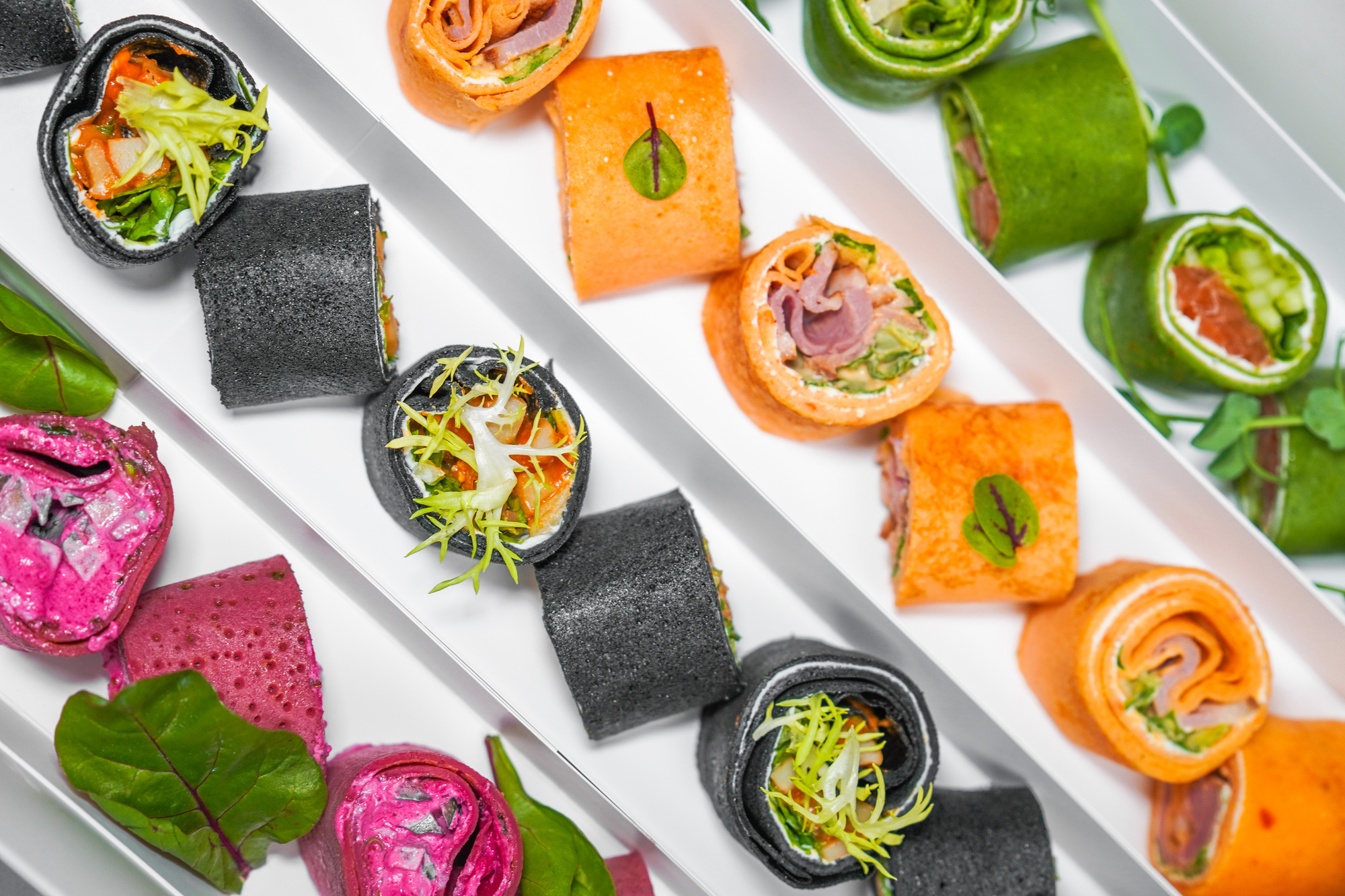 Ніжні млинці: томатні, шпинатні, бурякові та з чорнилами каракатиці. З начинками з лосося, фети, шпинату та огірка. 1000 г гастрономічного кольору для стильних подій